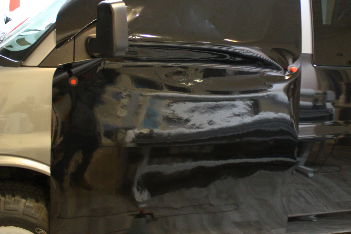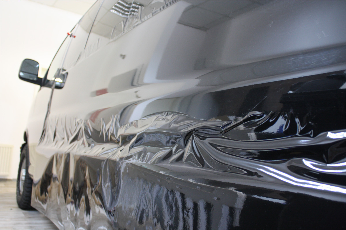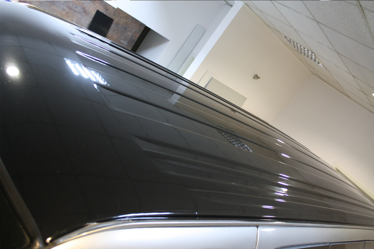 So ein riesen Seitenteil ist alles andere als einfach zu kleben, aber besonders audfwendig war das dach schwarz zu folieren. An der Tür sieht man noch ein Stück der originalen Farbe.