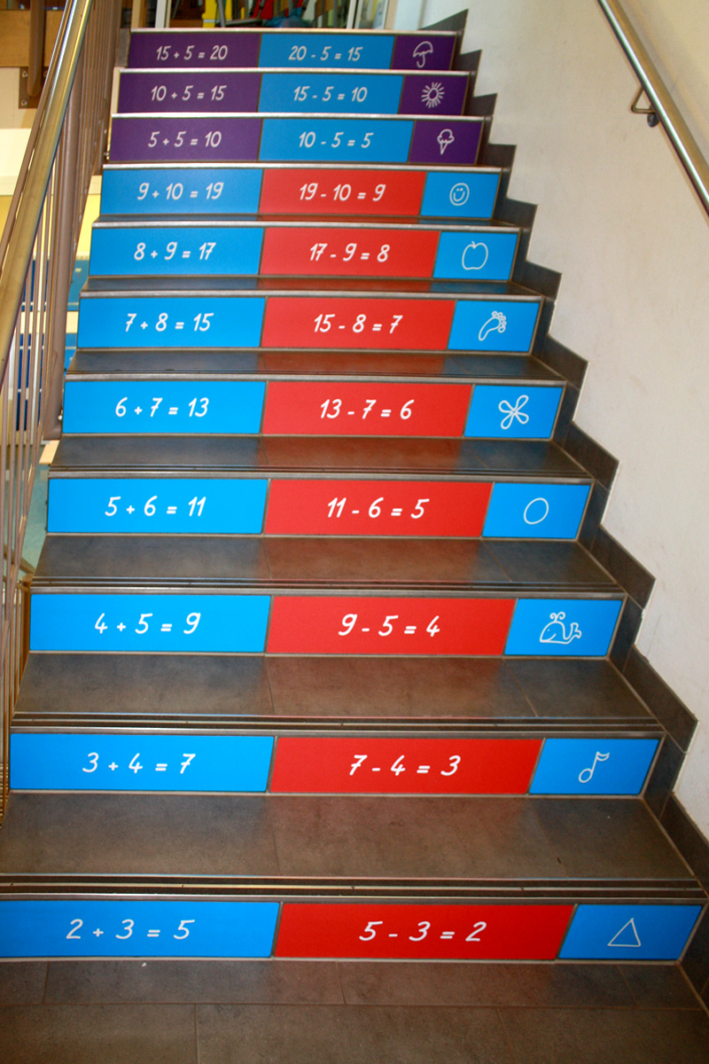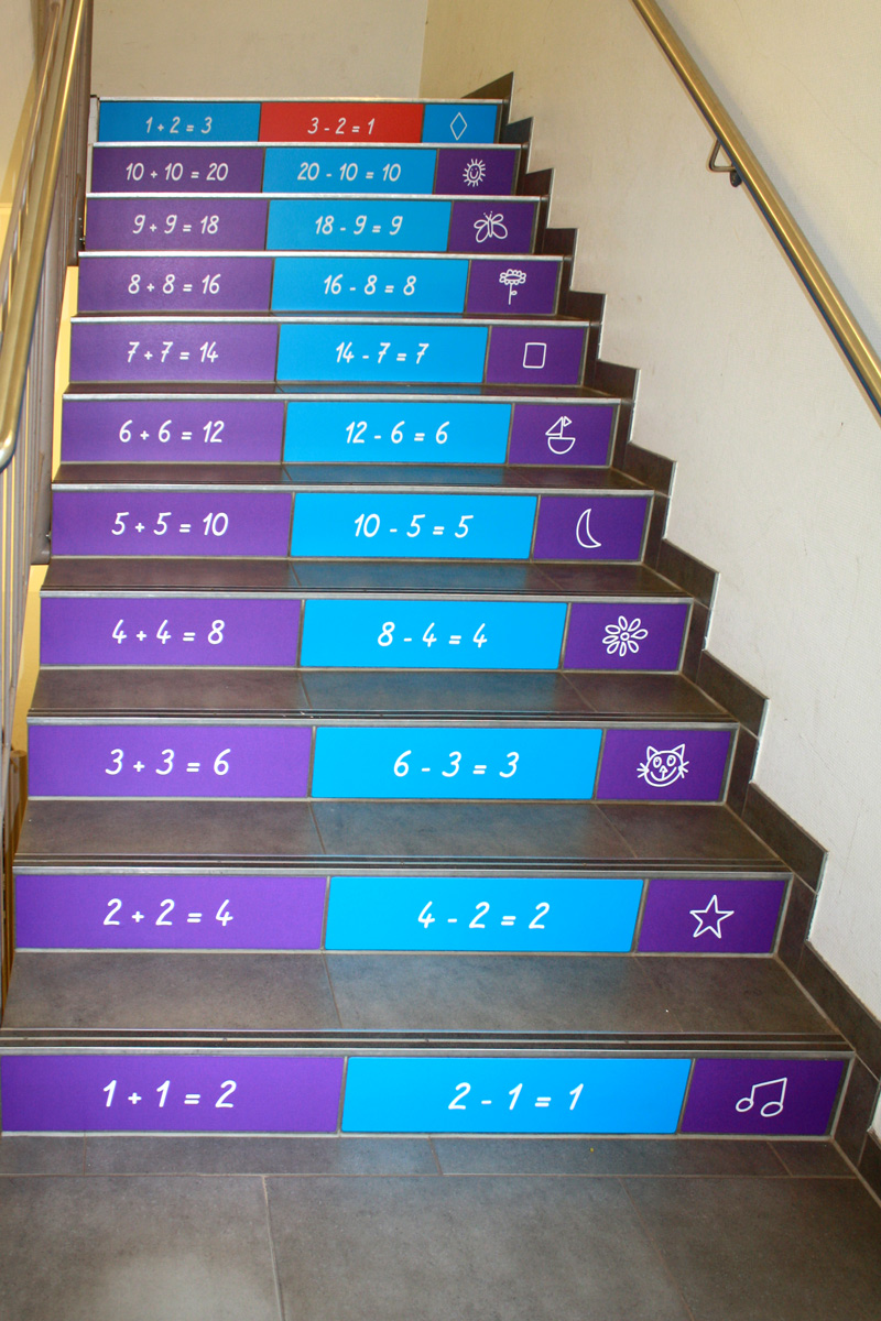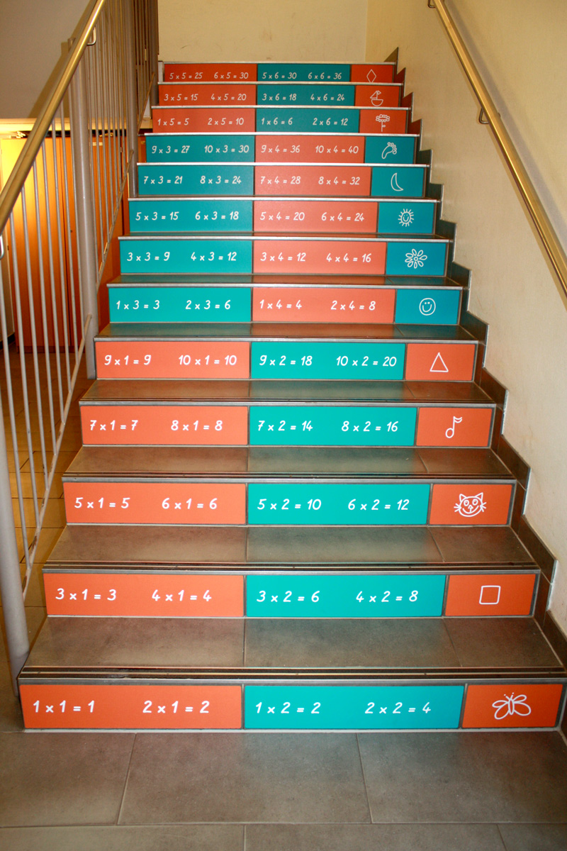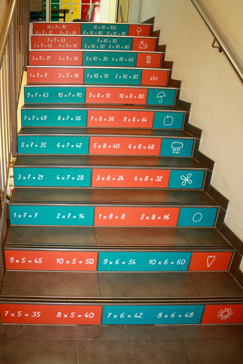 Während die Kinder bei 35 Grad am Baggersee liegen, haben wir die Schule gepimpt. Hier klebe ich die letzten Aufgaben an die Stufen.